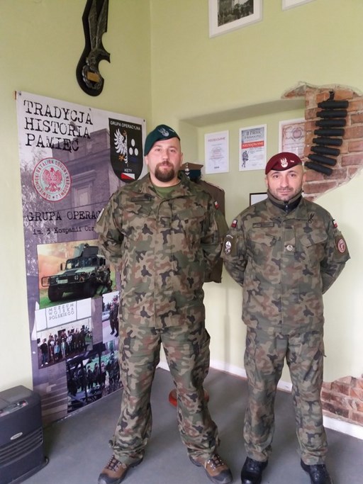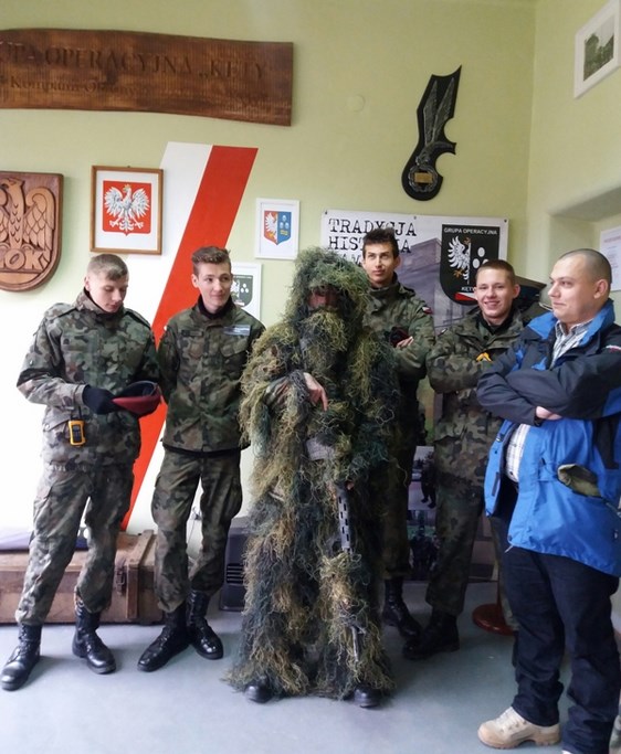 Dzięki zaproszeniu Maćka mieliśmy możliwość zapoznania się z historią obiektu, zwiedziliśmy Izbę Tradycji, a także zaprezentowano nam sprzęt i elementy wyposażenia wojskowego, którym dysponuje stowarzyszenie. Maciek pokazał się nam zarówno w tradycyjnym mundurze szkoleniowym, ale i w tzw. ghillie suit czyli specjalnym stroju maskującym używanym głównie przez strzelców wyborowych. Zademonstrował różne typy broni strzeleckiej czy wojskowego sprzętu łączności, a wspomagali go jego młodzi koledzy z grupy. Maciek, zapytany o kadrę szkolącą młodzież, przedstawił nam p. Dawida Grygierczyka – dowódcę grupy odpowiedzialnego za szkolenie z zakresu strzelectwa oraz samego szefa szkolenia całej Grupy Operacyjnej – starszego sierżanta rezerwy p. Zbigniewa Kurnika. Ogromną niespodzianką okazało się dla nas spotkanie z innymi członkami grupy- żołnierzami rezerwy i jednocześnie naszymi absolwentami : p. Waldemarem Chlebowskim oraz p. Markiem Walusiakiem. Młodzi członkowie GO doskonalą się zatem pod okiem profesjonalistów, znających wojskowe rzemiosło nie tylko z teorii, ale i od strony praktycznej we współpracy z Ochotniczą Strażą Pożarną w Kętach.